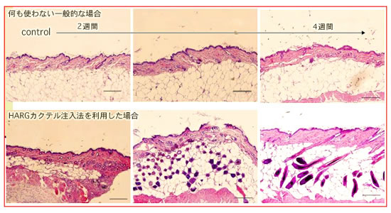 下図の動物実験DATAにより、HARGカクテルにより毛髪を包む毛包が再生され、発毛している様子がわかります。